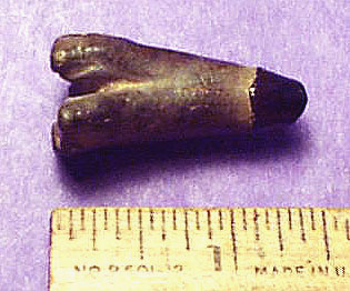 as the flattened blade. The bottoms of the roots are marked with grooves running perpendicular to the deep groove. The