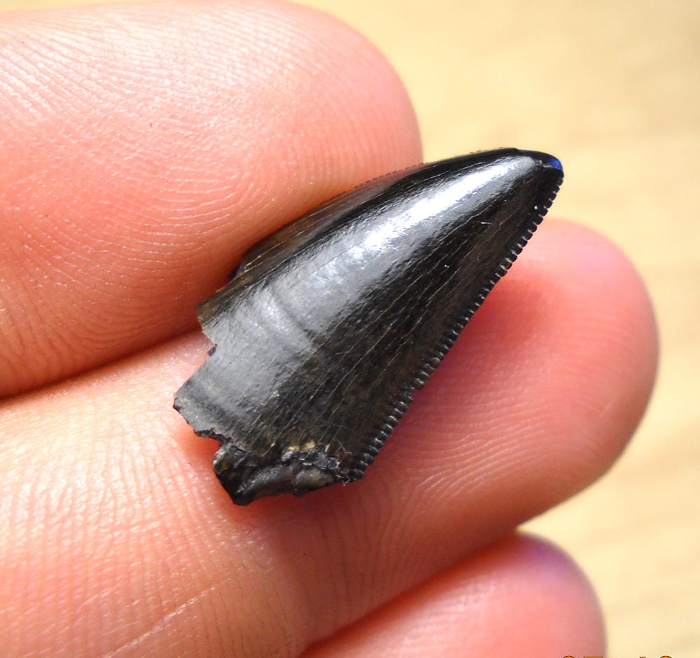 a highly compressed lens shaped cross section with strong serrated carinae. Most teeth are about 2 cm (about .75 in) in length.