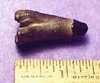 viewed from the bottom. The root is split one quarter of the distance up the root with a deep groove that is on the same plain